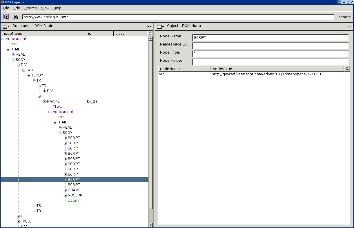 ...lets dig into that second, embedded #document. Go into the HTML node, then look at every SCRIPT node. Forget the ones that don't have a src attribute -- they're useless. We want the ones that get pulled in. There's a few comming from "gavads" but the number at the end will change. We need the last gavsad****.js URL with the number at the end.
